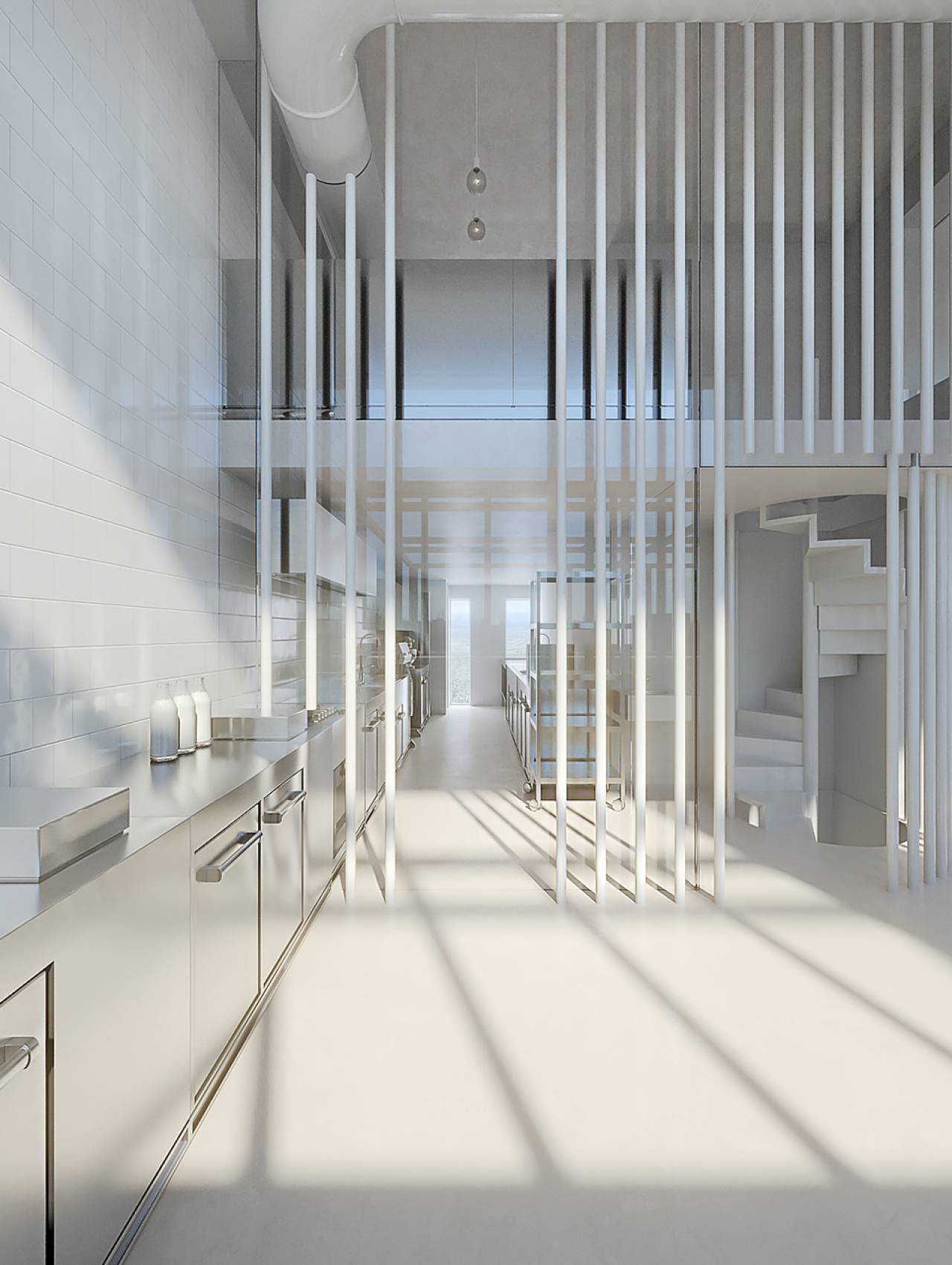 The unity of the whole space is achieved by the monochromia of the white color applied - fresh milk purity echo. Glossy textures of the floors and walls double spatial volume and create reflections, while the exposed ventilation pipes enhance industrial feel of the interior.